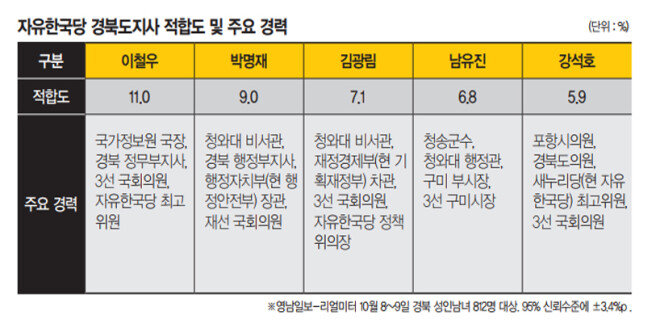 영남일보 여론조사에서 이철우 최고위원이 경북도지사 적합도 11.0%를 기록해 선두를 달리고 있다(표 참조). 이 최고위원은 국가정보원 국장 출신으로 경북 정무부지사, 3선 국회의원, 한국당 최고위원까지 초고속으로 질주해왔다. 그는 당내 대표적인 정보통으로 7월 한국당 전당대회 최고위원 투표에서 1위를 차지했으며, 친(親)홍준표 인사로 알려져 있다.