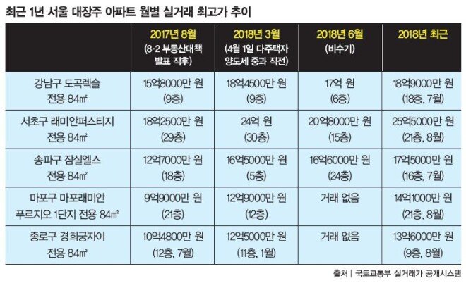 강남 3구의 유명 대단지 아파트인 서초구 반포동 래미안퍼스티지, 송파구 잠실동 잠실엘스 등도 비슷한 양상을 보였고, 강북에서도 언론의 조명을 받았던 마포구 아현동 마포래미안푸르지오, 종로구 홍파동 경희궁자이도 가격 추이가 비슷했다. 특히 마포래미안푸르지오의 경우 전용면적 84㎡가 지난해 8월 9억9000만 원에 거래됐던 것이 1년 뒤인 올해 8월 14억1000만 원에 팔려 약 42% 상승률을 기록했다.