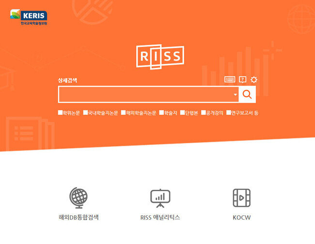RISS는 KERIS가 1998년부터 제공하고 있는 학술연구정보서비스로 국내 대학 및 기관에서 보유하는 학술자료와 해외의 우수 학술데이터베이스까지 다양한 학술연구정보를 검색 및 이용할 수 있고 국내 석박사 학위논문의 원문을 로그인 없이 무료로 이용할 수 있다.