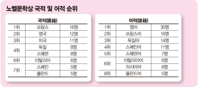 언어 사용자 기준으로 중국어, 힌두어와 더불어 세계 3대 언어에 포함된 스페인어 작가가 11명으로 4위다. 스페인 작가 5명에 중남미 작가 6명을 더한 숫자다. 노벨상 주최국 프리미엄을 누리는 스웨덴어 작가가 7명으로 5위다. 단테의 모국어인 이탈리아어와 도스토옙스키의 모국어인 러시아어 작가가 각각 6명으로 공동 6위.