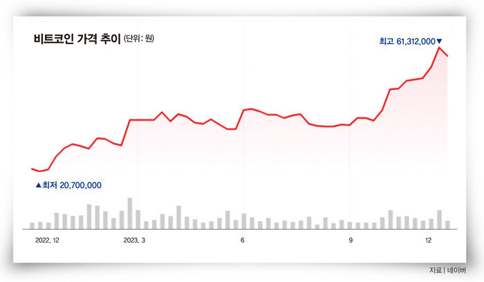 송 모 씨(32)는 지난달 가상화폐 투자로 50% 넘는 수익을 내 직장 동료들의 부러움을 샀다. 비트코인을 비롯해 눈여겨본 여러 알트코인에 분산투자했는데, 강세장이 펼쳐지면서 가상화폐의 시세가 큰 폭으로 뛴 덕분이다. 그는 지난해 가상화폐 가격이 크게 하락해 큰 부담 없이 투자했다고 한다. 송 씨는 “내년 1월 미국 증권거래위원회(SEC)에서 현물 비트코인 상장지수펀드(ETF)가 승인되면 ‘재료 소멸’을 이유로 가격이 하락할 수 있다”면서 “이는 비트코인이 금융자산으로 인정받았다는 의미이기도 해 장기적으로는 더 상승하리라 본다”며 기대감을 드러냈다.