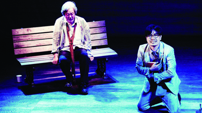 연극은 이렇게 벤치에 앉아 있는 김씨(오동식 분)와 그에게 질문하는 무명씨(명계남 분)의 대화로 시작한다. ‘노숙의 시’는 미국 극작가 에드워드 앨비(Edward Albee·1928~)의 ‘동물원 이야기(The Zoo Story)’를 한국 현실에 맞게 재창작한 작품. ‘동물원 이야기’는 부조리극으로, 1950년대 미국 사회의 병폐를 고찰했다. 이를 한국 사회에 그대로 옮겨놓기에는 현실성이 너무 떨어졌다. 연출자 이윤택은 극적 구성은 원작을 그대로 따라가면서, 굴곡진 현대사의 상흔이 깃든 2017년 한국으로 무대를 옮겼다. 50분의 원작을 90분으로 조정한 ‘노숙의 시’는 극적 구성이나 사건 충돌 없이 오롯이 배우들의 대사로만 진행된다. 원작 ‘동물원 이야기’는 광장에서 북쪽 숲으로 가는 길목에서 생기는 일이고, ‘노숙의 시’는 광장의 기억을 안고 검둥개를 만나러 가는 길에서 이야기다.