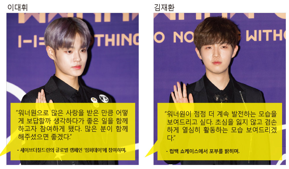 이렇듯 팬들로부터 넘치게 사랑받는 워너원은 돌려줄 줄도 안다. 컴백과 동시에 워너원은 국제구호개발 비정부기구(NGO) 세이브더칠드런의 글로벌 캠페인 ‘점퍼데이’를 함께하는 등 국민 프로듀서들로부터 받은 사랑에 보답하고자 사회 공헌 활동도 펼치고 있다. 더욱 파워풀하고 뷰티풀해진 그들을 만나보자.