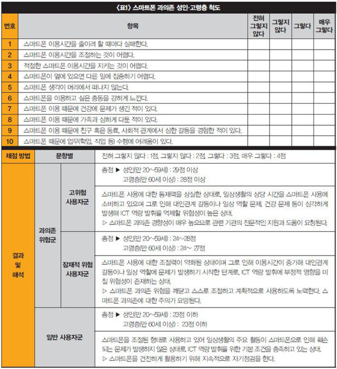 기자도 성인·고령층 대상 진단을 해봤다. 결과는 다소 충격적이었다. 총점은 25점으로 ‘잠재적 위험 사용자군’에 들어갔다. 결과표에는 ‘스마트폰 사용에 대한 조절력이 약화돼 이용시간 증가로 대인관계 갈등, 일상 역할에 문제가 발생하기 시작한 단계’라고 설명돼 있었다. 좀 더 심해지면 ‘ICT(정보통신기술) 역량 발휘에 부정적 영향을 미칠 위험성이 존재하는 상태’라는 우려도 덧붙어 있었다.