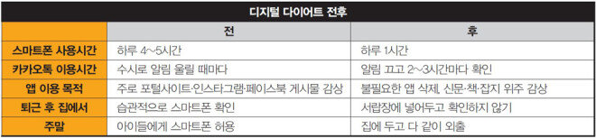 남편의 핀잔에도 굳은 결심을 한 데는 이유가 있다. 근무시간 중간 중간 카카오톡(카톡) 메시지를 확인하고, 인터넷 포털사이트 실시간 검색어를 쓸데없이 클릭하며, 한 가지 일에 몰입하는 시간이 짧아지는 등 일상생활에서 집중력이 떨어지고 있음을 느꼈기 때문. 신체적 변화의 문제도 있었다. 출퇴근길 스마트폰으로 각종 기사 검색, 지인들의 소셜네트워크서비스(SNS) 계정 파도 타기 등 손에서 스마트폰을 놓지 않다 보니 오른쪽 손목과 엄지가 저린 데다, 잠들 때쯤엔 눈이 침침하고 머리가 지끈거려 피로감이 느껴졌다. 이대로 살다간 머지않아 건강에 적신호가 켜질 것 같은 불안이 엄습했다. 30대 후반이 되면서 체력과 머리가 예전 같지 않아 생긴 일로 치부하기엔 스스로 생각해도 스마트폰 의존도가 지나치게 높았다.