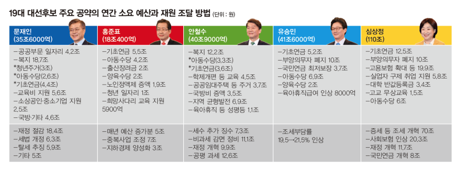 하지만 공약을 위한 막대한 재원을 어디서 끌어올 것이냐는 점에선 문, 안, 홍 등 주요 대선후보들이 구체적인 수치를 제대로 내놓지 못하고 있다. 문 후보는 세법 개정과 탈루세금 추징 등으로 12조2000억 원을, 재정지출 절감과 기금 여유 재원 활용으로 21조4000억 원을 마련하겠다고 했다.