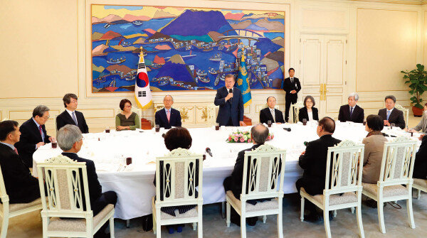 문재인 대통령은 5월 2일 오전 청와대 본관 인왕실에서 사회원로들과 비공개 오찬간담회를 가졌다. 이날 간담회에 참석한 원로는 이홍구 전 국무총리, 윤여준 윤여준정치연구원 원장, 이종찬 우당장학회 이사장, 김명자 한국과학기술단체총연합…