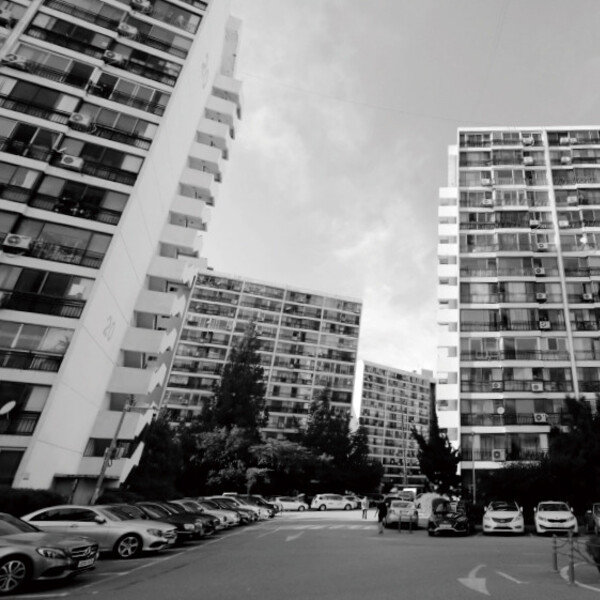 먹구름 아래 숨죽인 무채색 도시