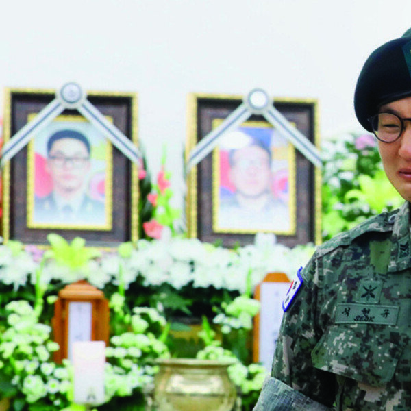 [뉴시스]8월 21일 ▲ K-9 포사격 훈련 도중 불의의 사고로 순직한 고(故) 이태균(26) 상사와 정수연(22) 상병의 합동영결식이 열린 경기 성남 국군수도병원 영결식장에서 석현규 중사가 추모사를 마친 뒤 눈물을 흘리고 있다…