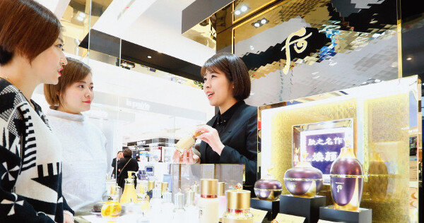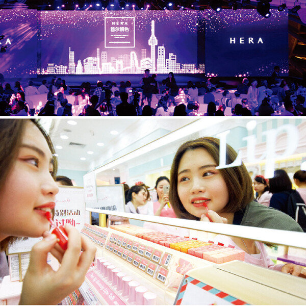 아모레퍼시픽은 색조제품군이 강세를 보이는 브랜드 ‘헤라’를 지난해 7월 중국에 정식 출범했다(위). 중국 청두의 한 플래그십 스토어에서 제품을 사용해보는 고객.[사진 제공·아모레퍼시픽 ]중국에서 10여 년 전부터 한국 드라마가 큰 …