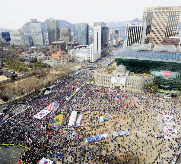 3월 25일 오후 서울광장 일대에서 ‘제3회 탄핵무효 국민저항 총궐기 국민대회’가 열렸다. [동아 DB]6월 현재 한국 보수는 궤멸의 위기에 처했다. 19대 대선에서 최다 표차로 정권을 내줬기 때문만은 아니다. 대선 패배는 보수 몰…