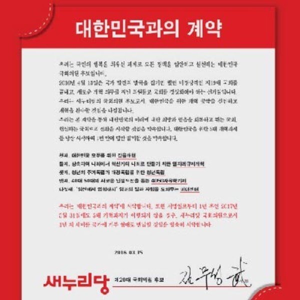 지난해 3월 15일 새누리당(현 자유한국당)이 발표했던 ‘대한민국과의 계약’ 광고.지난해 20대 총선을 앞두고 당시 새누리당 의원들이 “5대 개혁과제를 이행하지 못하면 세비를 반납하겠다”고 약속한, 일명 ‘대한민국과의 계약’ 공약 …