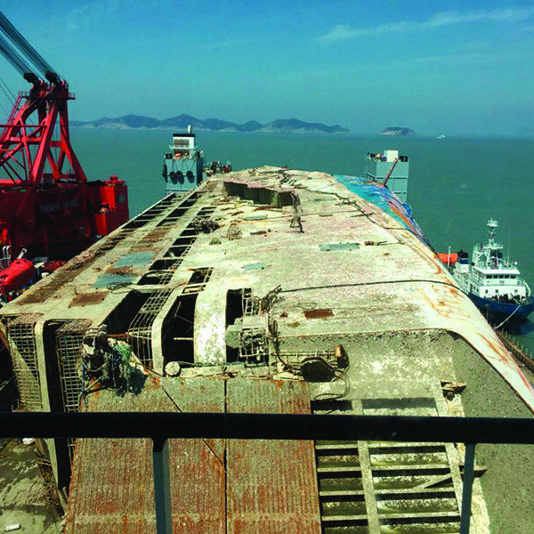 ‘2014년 4월 16일 08시 50분경 세월호의 비정상적인 급변침에 의하여 선체가 좌현으로 15~20도가량 급작스럽게 기울기 시작하였다. 고박이 부실하게 된 컨테이너나 일반 화물이 좌현으로 먼저 쏠리면서 횡경사가 계속되었고, 연이…