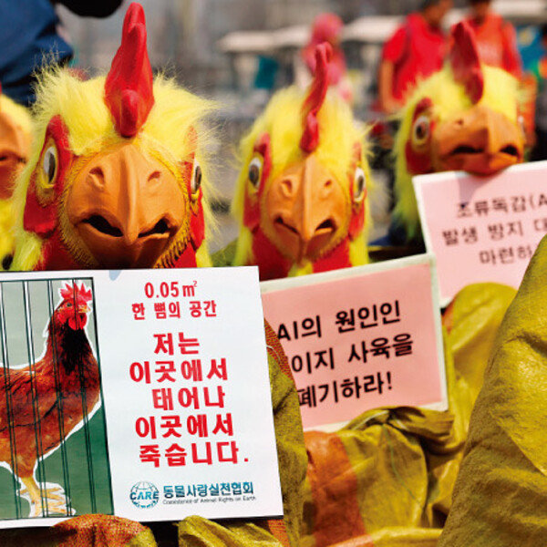 2014년 3월 동물사랑실천협회 회원들이 서울 광화문광장에서 닭 모양의 탈을 쓴 채 “조류독감(AI)에 따른 생매장 도살처분을 중단하라”며 퍼포먼스를 하고 있다. [동아일보 김미옥 기자]최근 서울 한 아파트 주민들이 안락사 직전의 …