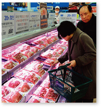 서울 한 대형마트에서 고객이 삼겹살을 고르고 있다. [뉴스1]삼겹살에 이어 치킨까지 줄줄이 가격이 오르면서 서민 물가에 비상이 걸렸다. 3월 2일 BBQ는 이르면 이달 중순부터 치킨 가격을 메뉴별로 5~10% 인상하기로 했다. 대표…