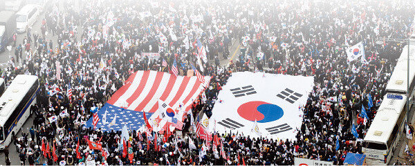 3월 1일 오후 서울 종로구 세종대로에서 열린 ‘대통령 탄핵기각을 위한 국민총궐기 운동본부’ 주최 집회에서 참가자들이 태극기를 흔들며 ‘대한민국 만세’를 외치고 있다.[동아DB]“힐러리 클린턴이 인구통계(demographics)를 …