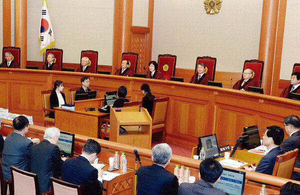 2월 1일 박한철 전 헌법재판소장 퇴임 후 처음 열린 박근혜 대통령 탄핵심판 변론기일의 재판정 모습. 박 전 소장이 앉던 법대 가운데 자리(점선 안)에 이정미 헌법재판소장 권한대행이 앉았다. [공동취재단]“헌법연구관 20여 명이 참…