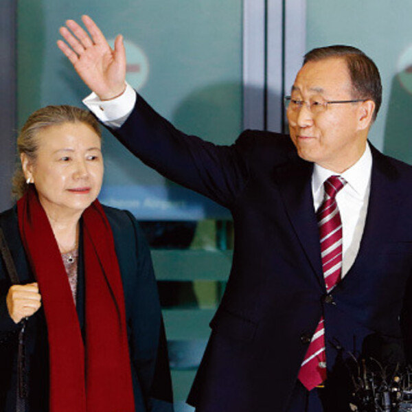 1월 12일 오후 인천국제공항 입국장에 들어선 반기문 전 유엔 사무총장(오른쪽)과 부인 유순택 여사. [박해윤 기자]여권의 유력 대권주자로 꼽히는 반기문 전 유엔 사무총장이 10년간 임기를 마치고 1월 12일 인천국제공항을 통해 귀…