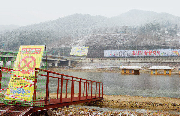 포근한 날씨와 지난해 12월 내린 겨울 폭우로 강원도 겨울축제가 취소되거나 축소될 위기에 놓였다. 사진은 12월 27일 얼음이 얼지 않은 강원 홍천군 ‘홍천강 꽁꽁축제’장 모습. [지호영 기자]“올해는 얼음이 꽁꽁 얼어야 하는데 걱…