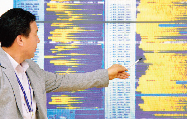 9월 19일 서울 동작구 기상청에서 기상청 관계자가 같은 날 경북 경주에서 발생한 리히터 규모 4.5의 여진 파형을 설명하고 있다. [뉴스1]유례없는 대형 지진이 연달아 발생해 국민의 불안이 높아지고 있다. 7월 5일 울산 앞바다에…