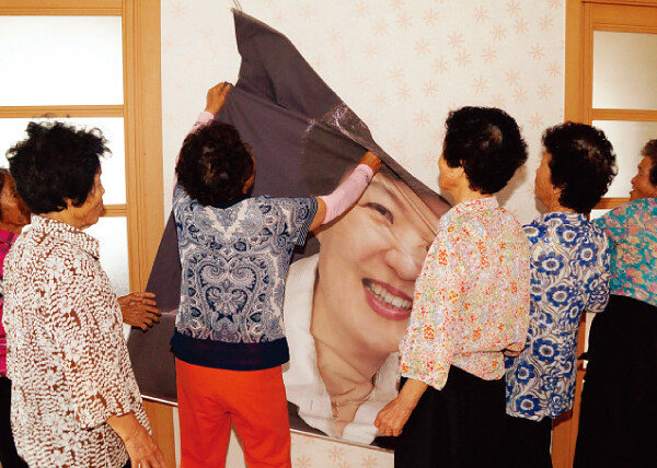 경북 성주군 한 노인정에서 노인들이 한쪽 벽에 커다랗게 붙어 있던 박근혜 대통령 사진을 떼고 있다. [뉴시스]역대 대통령 직무수행 평가를 살펴보면 한 가지 공통점이 눈에 띈다. 집권 초에는 모두가 50%를 상회하는 높은 지지율을 기…