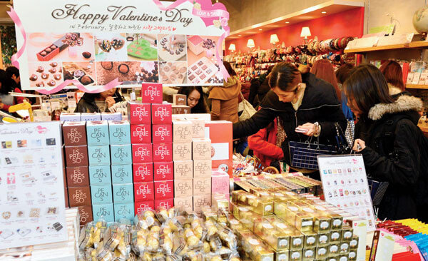 매년 밸런타인데이(2월 14일)를 전후로 엄청난 양의 초콜릿이 팔린다. 편의점에서는 큰 바구니에 초콜릿과 인형 등을 담아 선물용으로 포장해 진열하고, 대형마트에서는 출입구와 가장 가까운 쪽에 초콜릿 특별 판매 진열대를 설치한다. 입…