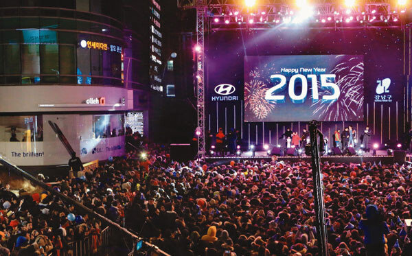 서울 강남구 강남역 근처에서 2015년 카운트다운 세리머니를 마친 연인이 새해 소망을 적은 애드벌룬 조명 앞에서 키스를 나누고 있다. Canon EOS-1DX, ISO 3200, F8, T-1/125Sec, 렌즈 14mm