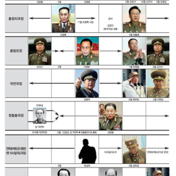 김정은 체제 출범 이후 군 수뇌부의 잦은 인사교체를 두고 쏟아져 나오는 기사는 주로 새로 등장한 인물의 면면에 관심을 쏟는다. 북한군을 ‘전투하는 군대’로 변화시키려고 야전 지휘관(1군단장) 출신인 장정남을 인민무력부장에 임명했고,…