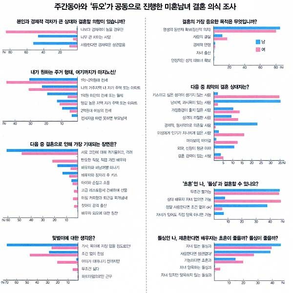 미혼남성은 ‘낭비벽과 과시욕이 있는 여성’을, 미혼여성은 ‘키스하고 싶은 생각이 전혀 안 드는 성적 무매력 남성’을 최악의 결혼 상대자로 꼽았다. 또 결혼의 가장 큰 목적으로 남녀 모두 ‘평생의 동반자 확보’를 선택했으며, ‘부부가…