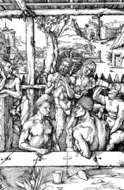 알브레히트 뒤러의 판화. 언뜻 보면 중세 말 목욕탕 장면을 그린 풍속화로 보인다. 하지만 그 안에는 또 다른 제재가 감추어져 있다. 욕실 안을 들여다보는 남자는 시각, 음악을 듣는 남자는 청각, 꽃을 든 남자는 후각, 플루트를 연주…