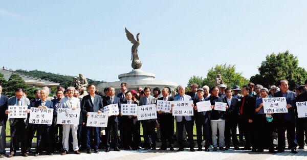 ‘사회정의를 바라는 전국교수모임’ 소속 교수들이 9월 19일 서울 종로구 청와대 분수 앞에서 조국 법무부 장관 임명 철회를 촉구하고 있다.