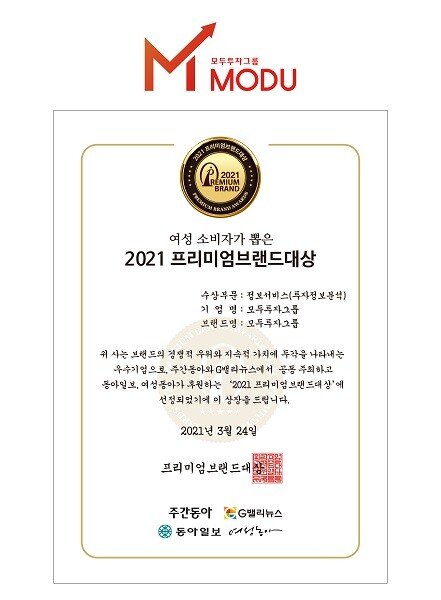 모두투자그룹이 ‘여성소비자가 뽑은 2021 프리미엄브랜드대상’에서 정보서비스(투자정보분석) 부문을 수상했다. 해당 브랜드대상은 소비의 주체인 현명한 여성들의 선택을 받은 브랜드를 발굴하고 시상함으로써 다양한 분야에서 프리미엄브랜드로…
