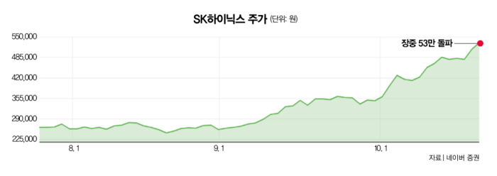 이 같은 목표주가는 SK하이닉스가 주가순자산비율(PBR) 2배 이상을 정당화할 수 있다는 점을 전제로 도출됐다. HBM 경쟁력 덕에 SK하이닉스가 일반 메모리 기업이 아닌, 안정적 수익 구조를 가진 AI 핵심 기업으로 발돋움한 만큼 시장이 이에 대한 프리미엄을 인정해야 한다는 것이다. 김록호 하나증권 연구원은 “HBM은 사이클 산업 특성상 실적 변동성이 큰 메모리업체의 근본적인 저평가 이유를 완화한다”면서 “HBM 매출 비중이 전체의 45%에 육박하는 SK하이닉스는 PBR에 할증을 적용해 최상단을 새롭게 형성해야 한다”고 평가했다. 이에 따른 목표주가는 기존 PBR 최상단에 30% 할증(2.65배)을 적용한 58만 원이다. HBM 가치를 별도 평가해 일반 메모리보다 높은 멀티플을 줄 경우 60만~64만 원 목표주가 산출도 가능하다는 설명이다.한편 지난달 SK하이닉스를 1조3660억 원가량 순매수하며 급등세를 이끈 외국인투자자는 10월 들어 포트폴리오를 조금씩 조정하고 있다. 10월 17~23일 외국인은 SK하이닉스를 도합 1조6230억 원어치 처분했다가 24일 매수를 재개했다. 이에 대해 염승환 LS증권 이사는 “외국인이 같은 반도체 섹터 안에서 밸류에이션 매력이 더 큰 삼성전자 쪽으로 포트폴리오를 일부 수정한 것”이라며 “(SK하이닉스가) 더 빠르고 강하게 오른 데 따른 일시 매도일 뿐, 연말까지 호실적을 바탕으로 한 주가 상승은 계속될 것”이라고 말했다.