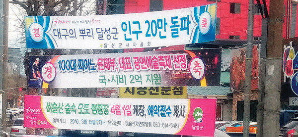 대통령의 정치적 고향 달성, 활짝 꽃피다대구 달성군 곳곳에는 군 인구가 20만 명을 넘어섰다는 플래카드가 걸려 있다. 구자홍 기자대구지하철 1호선은 대구 동북쪽 안심역에서부터 동대구역과 대구역을 거쳐 2호선과 교차하는 반월당역, 3…