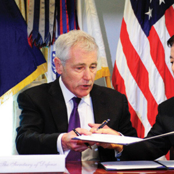 2014년 10월 23일(현지시각) 한민구 국방부 장관(오른쪽)이 미국 워싱턴 국방부 청사에서 전시작전통제권 전환 재연기를 명시한 양해각서(MOU)에 서명한 뒤 척 헤이글 미 국방부 장관에게 건네고 있다. 사진 제공· 국방부‘로켓군…