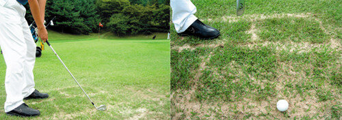 그린 주위 모래바닥에서가끔 그린 주위 잔디가 많이 상해서 모래밭처럼 돼 있는 경우를 보았을 것이다. 이럴 땐 감각이 아닌 기계적인 스윙을 해야 한다. 클럽은 웨지나 숏 아이언보다 미들 아이언, 롱 아이언을 선택하는 것이 유리하다. …