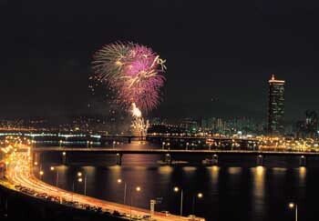 5월25일 밤 월드컵을 기념해 한강변에서 세계불꽃놀이축제가 열리고 있다. 사진으로 보는 월드컵 세상 60억 감동의 그라운드 양화대교 중간에 위치한 선유도와 한강 둔치를 잇는 새 다리. 월드컵 개막 기념으로 조성됐다. ‘…