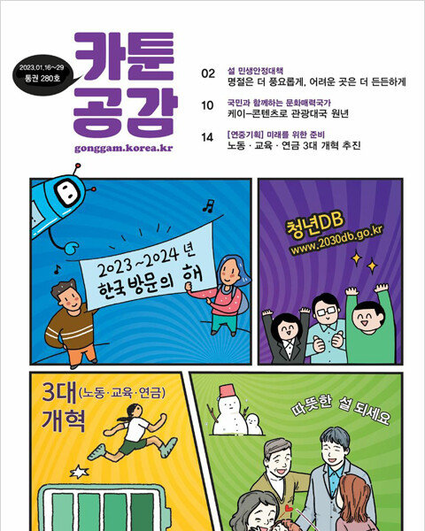 정책을 만화로 알기 쉽게 소개하는 ‘카툰공감’ 280호(2023.1.16~29)가 발간됐다.이번 호에는 취업애로청년을 정규직으로 채용한 기업주에게 정부가 제공하는 인건비 지원 정책을 소개하는 ‘공감이 출동’, 명절을 더 풍요롭게 즐…