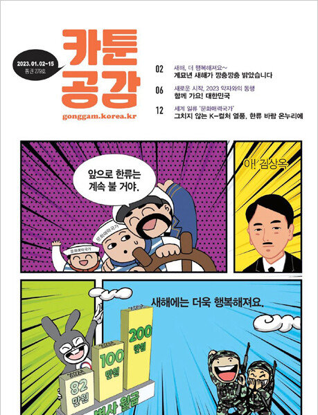 재미있는 만화로 정책을 소개하는 ‘카툰공감’ 279호(2023.1.2~15)가 발간됐다.이번 호에는 모든 정부 지원금을 확인하는 방법을 소개한 ‘공감이 출동’, 새해 병사 월급 인상, 부모 급여 확대 등 2023년 달라지는 정책을 …