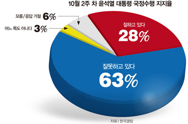 윤석열 대통령의 국정수행 지지율이 장기 정체 상태다. 여론조사 전문기관 한국갤럽이 10월 11일부터 사흘간 전국 성인 남녀 1002명을 대상으로 실시한 10월 2주 차 조사에서 윤 대통령이 직무수행을 ‘잘하고 있다’는 응답은 28%…