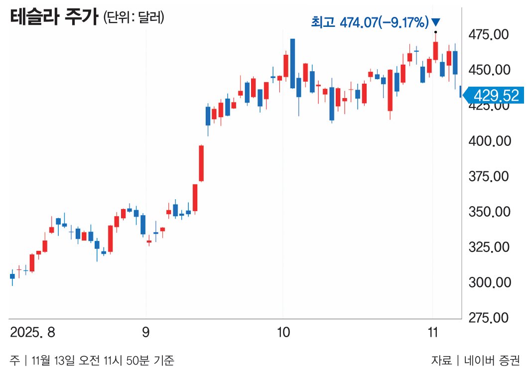 미래 사업 속도전에 테슬라 주가는 400달러대 지지선을 형성한 모습이다(그래프 참조). 안동후 이사는 “전기차 판매가 부진하다는 보도가 계속 나오는데도 주가가 옆으로 길어지기만 하는 이유는 시장이 AI, 로보틱스에 대한 프리미엄을 주고 있기 때문”이라고 말했다. 이어 그는 “최근 에너지저장장치(ESS) 매출이 급증한 것도 전기차 약세를 어느 정도 보충하는 측면이 있다”면서 “향후 미래 사업 전환이 가시적 성과를 보일 때마다 주가가 단기로 탄력을 받을 것”이라고 덧붙였다.