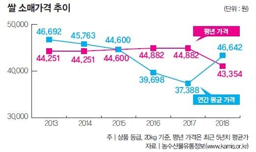 요즘 쌀값에 대해 전문가들은 “폭등이라기보다 정상화된 것”이라고 말한다. 2017년 쌀값이 워낙 많이 떨어져 올해 쌀값이 무척 비싼 것처럼 느껴진다는 것이다. 데이터는 이러한 전문가들의 견해를 뒷받침한다. 2018년 평균 쌀값은 4만3000원이 조금 넘는데, 이는 2013년부터 2015년까지 평균 쌀값과 유사한 수준이다. 다만 2016년(3만9698원)과 2017년(3만7388원)보다는 비싸다(그래프 참조).
