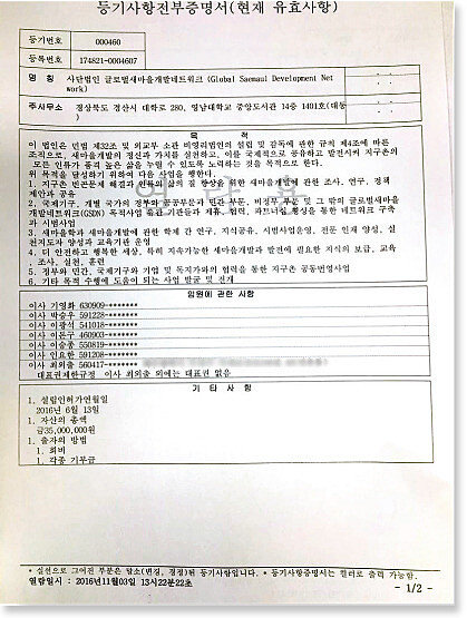 홈페이지에 오른 인물의 면면을 보면 규모 있는 단체인 듯하지만, 법인 등기부등본상 GSDN은 ‘지구촌발전재단’이라는 단체의 세부 목적 사업 가운데 하나에 불과하다. GSDN의 법인 설립신고서에 적힌 연락처를 확인한 결과, 대구 시내에 있는 지구촌발전재단의 전화번호로 확인됐다. 지구촌발전재단은 1993년 최 전 부총장이 1억51만 원 출연금으로 설립한 학술 및 장학재단이다. 지구촌발전재단의 법인 등기부등본에 따르면 앞서 보조금 논란을 빚은 단체인 글로벌새마을포럼과 GSDN 모두 이 재단이 하는 일개 사업일 뿐이었다.