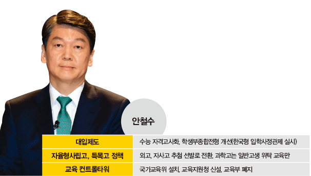 국민의당 안철수 후보는 4월 7일 한국사립대학총장협의회 정기총회에 참석해 “지금의 교육부는 ‘교육통제부’로 우리나라 발전에 발목을 잡고 있다”고 했다. 안 후보는 교육부 폐지와 학제 개편을 주요 공약으로 내걸었다. 자유한국당 홍준표, 바른정당 유승민, 정의당 심상정 후보 등도 한국 교육 현실에 대한 날카로운 비판을 쏟아내고 있다. 저마다 ‘교육대통령’을 자임하는 이들 가운데 누가 집권하든 현행 교육정책에 대변혁이 시작될 것이 분명하다.