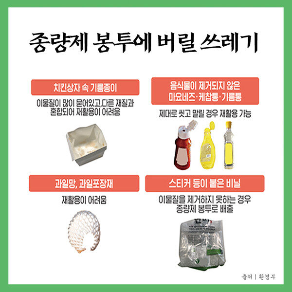 재활용 쓰레기인지 종량제 봉투에 버려야 할 일반 쓰레기인지 헷갈리는 대표적인 것이 치킨상자 속 기름종이, 미세척 컵라면 용기류, 음식물이 제거되지 않은 마요네즈나 케첩, 기름 용기 등이다. 이들 모두 일반쓰레기이므로 종량제 봉지에 담아 버린다. 과일망이나 과일포장재, 도자기류와 사기 그릇, 음식물이 묻은 비닐, 스티커가 붙은 비닐, 고무장갑과 아이스팩 등도 일반 쓰레기이므로 종량제 봉투에 담아야 한다.