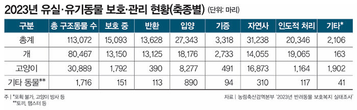 지자체 동물보호센터에 입소한 유기동물 상당수는 안락사됩니다. “불쌍한 유기동물을 왜 안락사하느냐”는 얘기가 있는데, 센터 공간에는 한계가 있고 운영비에 세금을 무한정 투입할 수도 없다 보니 입양되지 않은 개체를 사망할 때까지 데리고 있는 건 불가능합니다. 동물보호법에 따라 유기동물 공고를 낸 뒤 열흘이 지나면 지자체 동물보호센터로 소유권이 넘어가고, 이후부턴 센터에서 안락사할 수 있죠. 2023년 기준 동물보호센터의 유기동물 평균 보호 기간은 27.8일이었습니다.