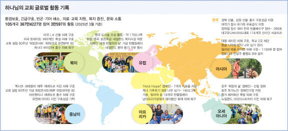 세계 각국에 설립된 교회들도 늘 분주하다. 올해 초 미국 LA 산불 때 캘리포니아주 일대 교회들이 열흘간 이재민 구호와 소방대원 식사 지원에 힘썼다. 페루·아르헨티나·말레이시아 홍수, 코스타리카 화재 현장에서는 피해 복구와 함께 구호품 제공 등이 이뤄졌다. 코로나19 팬데믹 당시에는 각국에 마스크와 소독제 지원, 취약계층 의료·생계 지원 등 다방면으로 도움을 주었다.