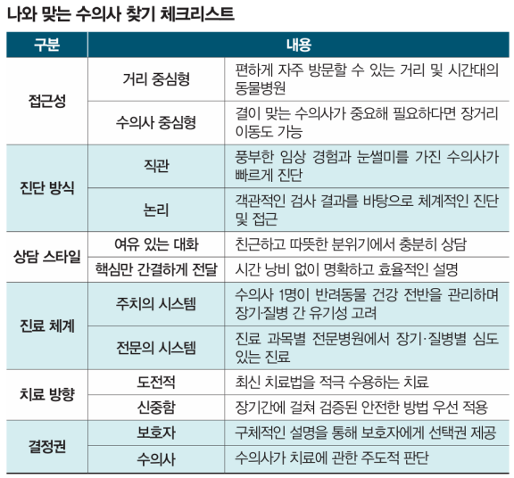 보호자가 불편함 없이 문제를 얘기할 수 있고, 이를 귀 기울여 들으며, 반려동물의 안위를 함께 고민해주는 수의사를 만나는 것. 그것이 ‘반려 생활’을 더욱 편안하게, 그리고 빛나게 하는 첫걸음이다. 그러니 망설이지 말자. 지금 주치의가 보호자와 결이 얼마나 잘 맞는지 찬찬히 생각해보자. 필요하다면 용기를 내 질문하고, 때로는 방향을 바꾸는 결단도 해보자. 그 선택이 반려동물에게 가장 도움이 되는 길이 될 테니.