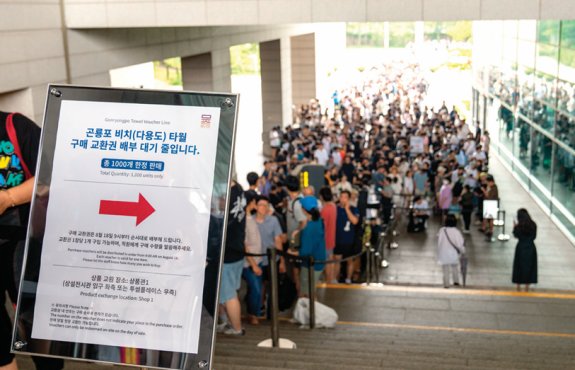 곤룡포 비치타월은 푸른 배경에 금빛 오조룡(5개 발톱을 가진 용)을 프린트한 수건으로, 오프라인 한정 판매만 진행했다. 1차로 준비한 500장이 금세 동이 나자 이날 2차 판매 때는 1000장을 준비하고 뮷즈숍 오픈 전 교환권을 배부하는 시스템도 마련했다. 교환권 장당 타월 1장으로, 인당 최대 2장까지 구매할 수 있었다. 기자는 오전 8시 30분, 교환권 배부 30분 전쯤 국립중앙박물관에 도착했다. 입구 쪽에는 사람이 거의 없어서 “예상보다 많지 않네”라고 생각한 순간 반대편 아래 계단 너머로 끝없이 이어진 줄이 보였다.