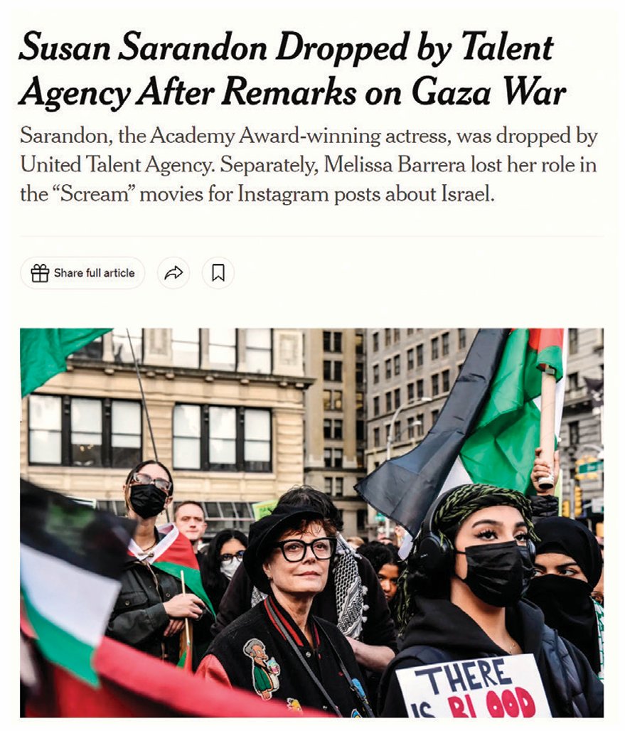 배우 수전 서랜든은 2023년 11월 친팔레스타인 집회에 참여해 가자지구에서 발생한 전쟁에 대한 의견을 밝혔다가 소속 에이전시에서 쫓겨났다. 해당 내용을 보도한 ‘뉴욕타임스’ 기사. 뉴욕타임스 홈페이지 캡처